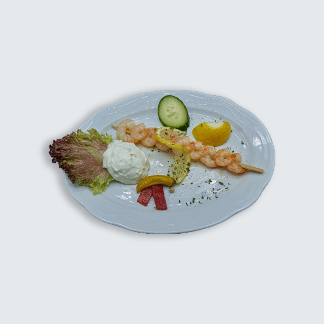 gebacken und mit Tzatziki garniert(G).
