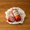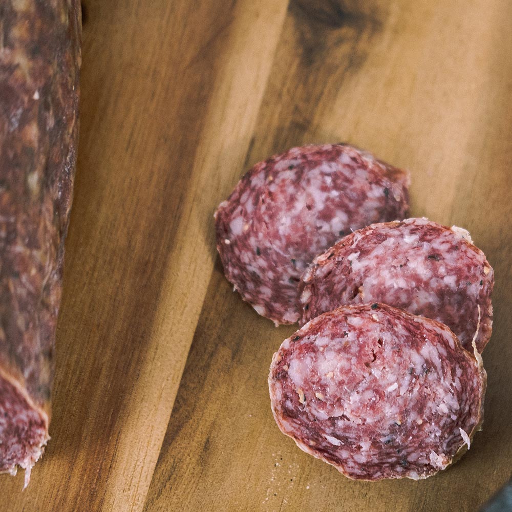 Mageres Schweinefleisch, Rückenspeck, schwarzer Pfeffer, frischer Knoblauch, Muskat, Zucker, Salz, Salpeter.