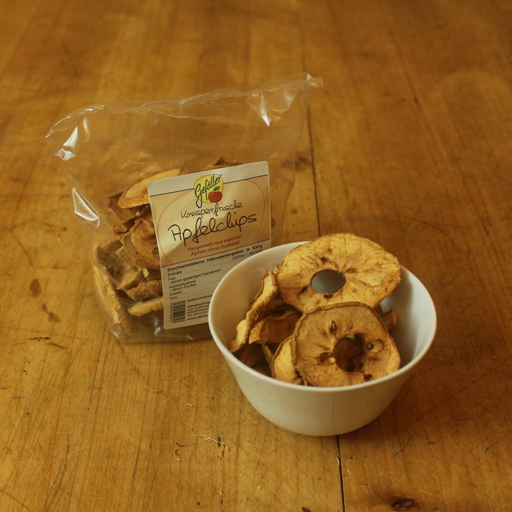 Apfelchips aus den frischen Äpfeln regionaler Streuobstwiesen, natürlich frei von Zusätzen.