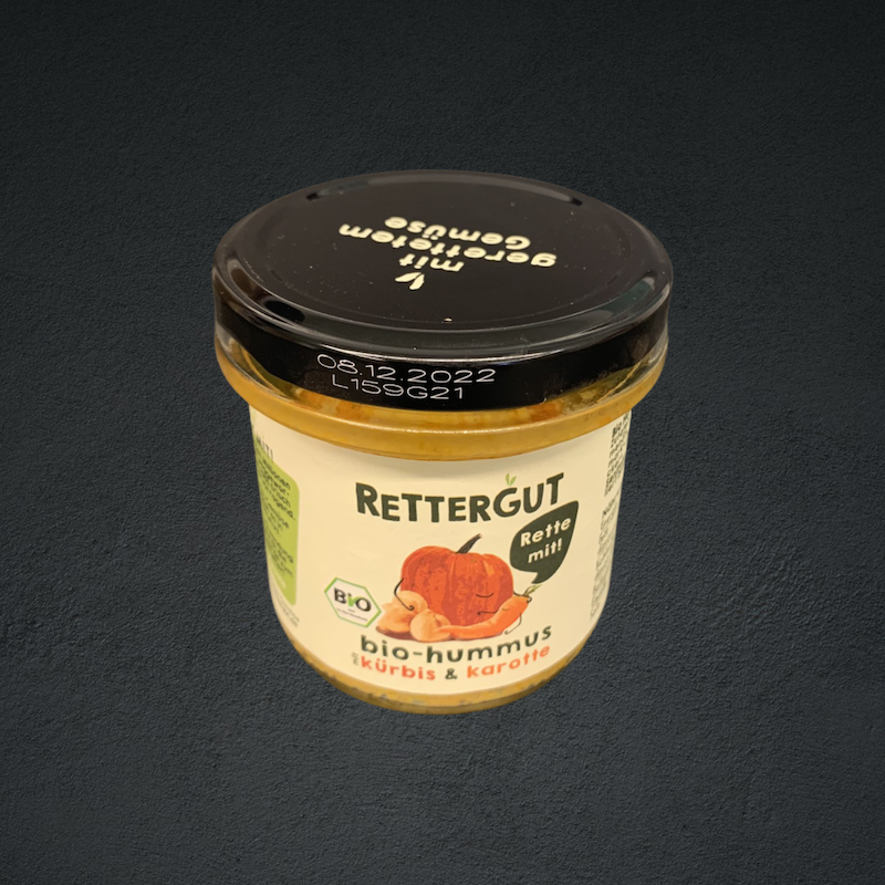 Wasser, Kichererbsen* 20%, Sonnenblumenöl*, Kürbis* 15%, Karotten* 10%, Tomatenmark*, SESAM*, Maisstärke*, Steinsalz, Rohrohrzucker*, Knoblauch*, Gewürze*, Curry* (enthält Senfmehl*), Zitronensaftkonzentrat*
