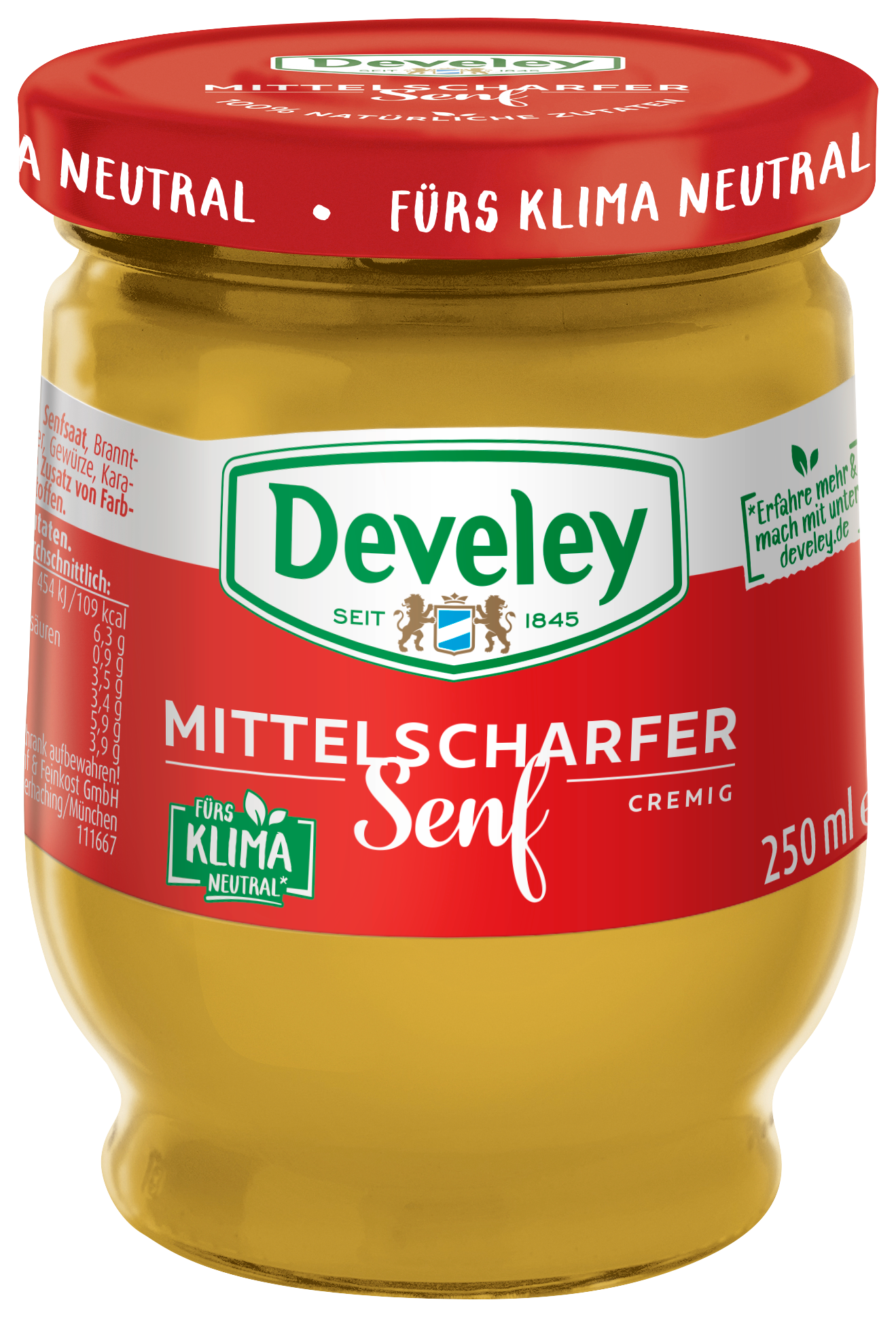 Unser Mittelscharfer Senf ist der würzig-milde Senf-Klassiker im Develey Sortiment. Sonnengereift und frisch vermahlen verleihen hochwertige Senfsaaten dem Würztalent sein unverwechselbares Aroma.