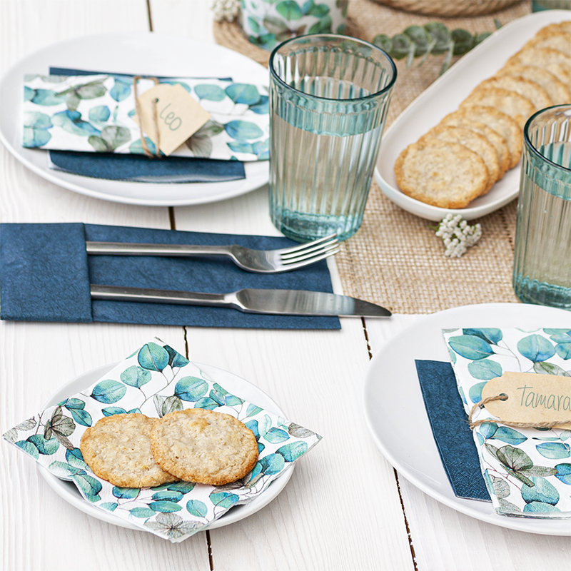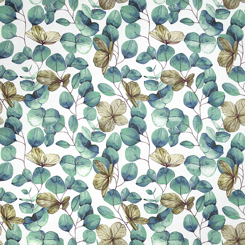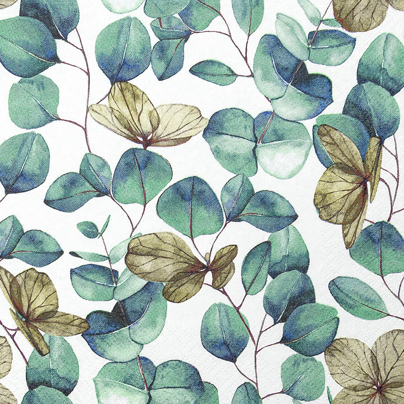 Entdecken Sie die stilvollen Eucalyptus Leaves Servietten, ideal für jeden Anlass und Dekoration in zarten Grün- und Weißtönen.