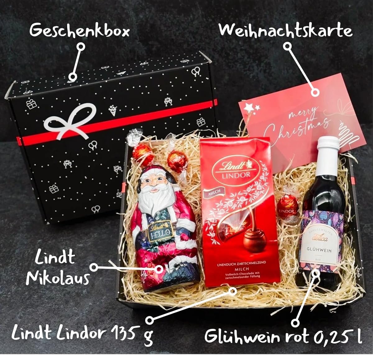 - 🎄 Weihnachtlicher Präsentkorb gefüllt mit bestem Inhalt: Winzer Wein rot, Lindt Nikolaus & Schokolade Pralinen & Weihnachtskarte. Verpackt in der edlen Geschenkbox