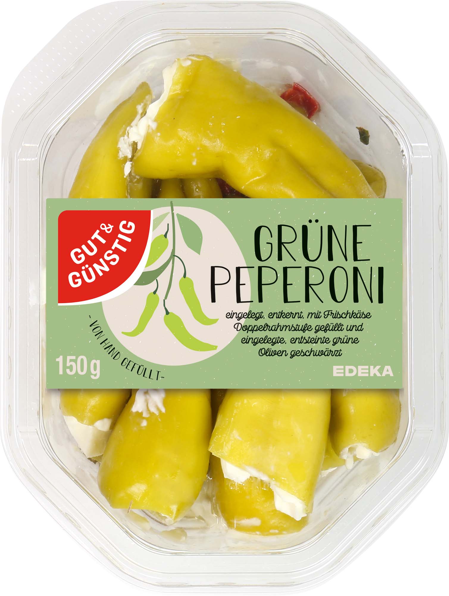 • eingelegt und entkernt • mit Frischkäse Doppelrahmstufe gefüllt • von Hand gefüllt