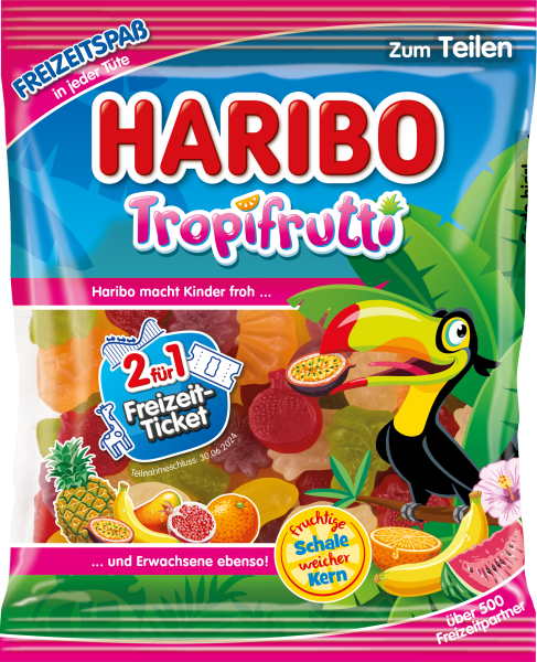 Tropifrutti macht das Leben einfach tropischer! Die einzigartige Konsistenz macht das beliebte Produkt aus und steht mit den tropisch-fruchtigen Geschmacksrichtungen Ananas, Banane, Granatapfel, Mango-Mandarine, Passionsfrucht und Melone sowie den Figuren Tukan, Palmen und den Früchten für die kleine Auszeit vom Alltag. Tropifrutti eignet sich perfekt zum Naschen mit Freunden.