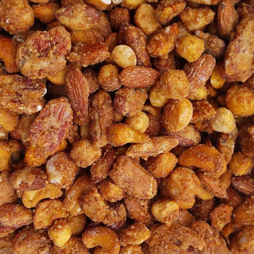 Edle Nussmischung aus Cashews, Mandeln, Macadamias, Haselnüssen und Pekannüssen – mit feinem Honig und Zucker glasiert für königlichen Genuss.