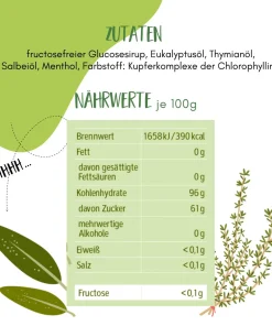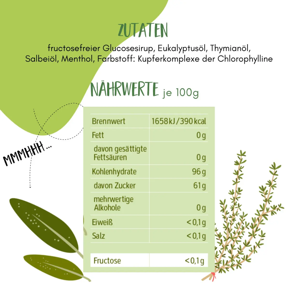 Hustenzuckerl: Fructosefreier Glucosesirup, Eukalyptusöl, Thymianöl, Salbeiöl, Menthol, Farbstoff: Kupferkomplexe der Chlorophylline