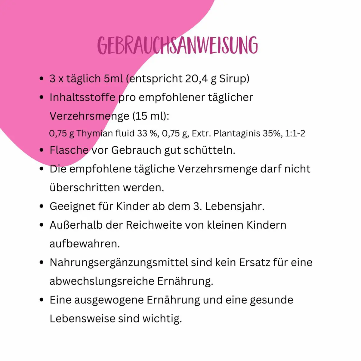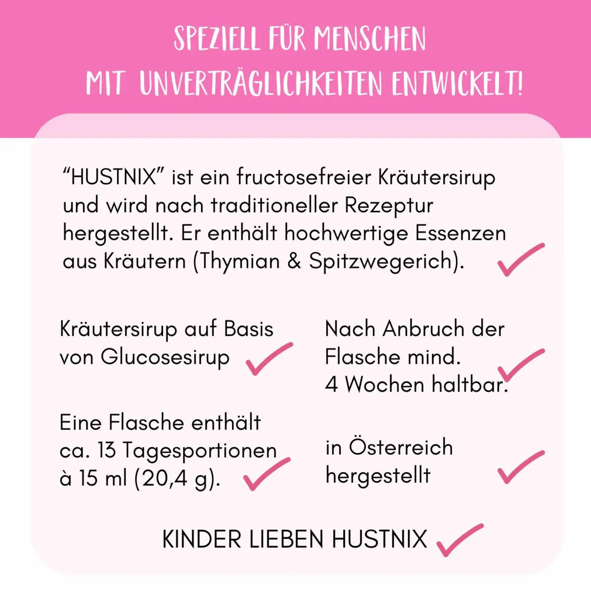 Eine genaue Beschreibung findest Du in der jeweiligen Produktbeschreibung: HUSTNIX® – Kräutersirup, Hustenzuckerl