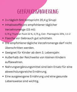 Kräutersirup: Fructosefreier Glucosesirup, Spitzwegerichextrakt, Thymianextrakt, Alkoholgehalt: 5% vol.