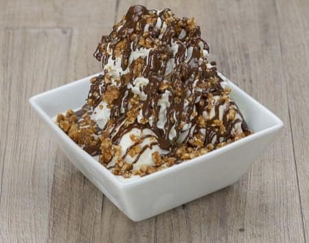 Krokant, Nutella, Joghurt, 3 Kugeln Joghurteis, Schlagsahne NUOG