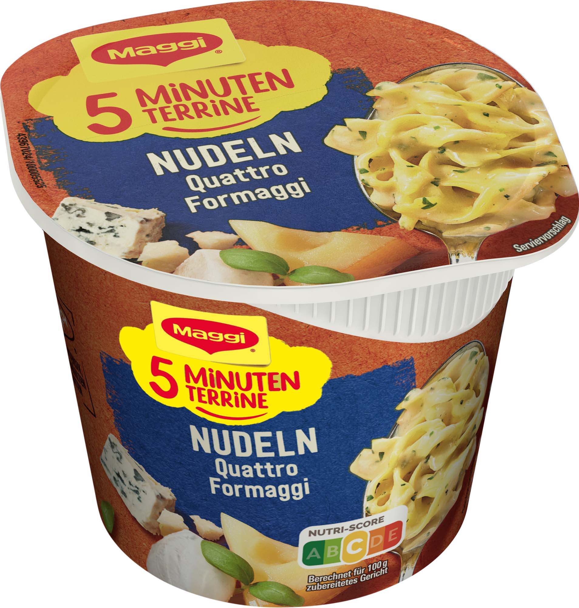 Lust auf leckere Nudeln in cremiger Käsesauce, aber keine Zeit zum Kochen? Kein Problem: mit der Maggi 5 Minuten Terrine Nudeln Quattro Formaggi ist das Wunschgericht in wenigen Minuten fertig. Genieße den aromatisch-cremigen Geschmack von Schmelzkäse, Parmesan, Mozzarella und Blauschimmelkäse. Schneller und unkomplizierter kann man leckere Nudeln in Käsesauce nicht zubereiten.