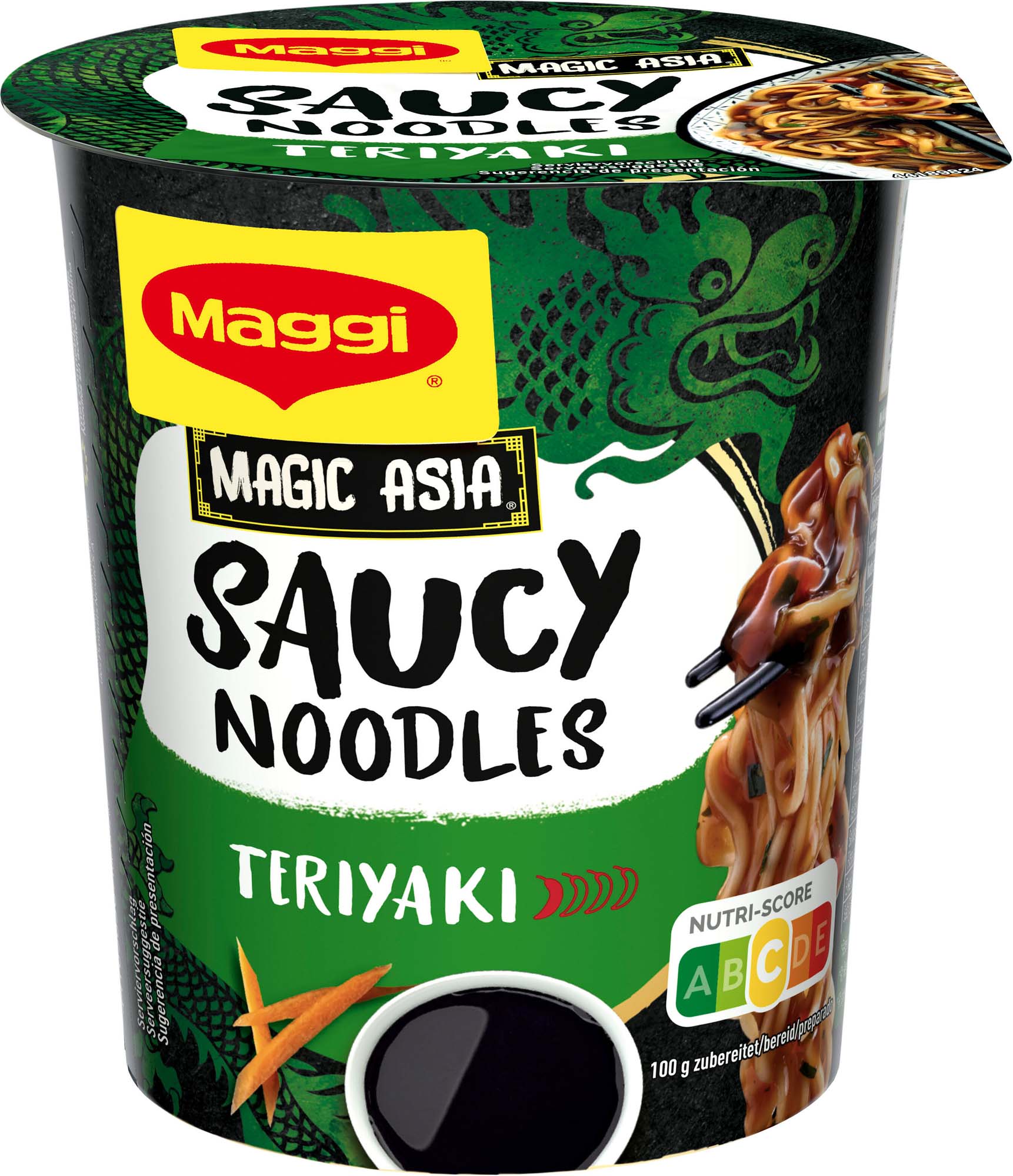 Maggi Magic Asia Saucy Noodles Teriyaki Cup ist ein leckerer Snack, der ohne viel Zubehör im Handumdrehen servierfertig ist: Praktische Zubereitung direkt im Becher und ohne Abgießen – ganz schnell und einfach. Der kürzeste Weg zum Lieblingsasiaten führt direkt in die eigene Küche, zum Nudelgericht im praktischen Becher. Maggi Magic Asia Saucy Noodles Teriyaki Cup – Schnelles Nudelgericht. Lust auf asiatisches Essen, aber keine Zeit in der Mittagspause das Büro zu verlassen? Maggi Magic Asia Saucy Noodles Teriyaki Cup ist die Lösung, im Nu ein leckeres und würziges Nudelgericht in asiatischer Würzung zu genießen. Platzsparend und haltbar wartet der Maggi Magic Asia Saucy Noodles Teriyaki Cup auf seinen Einsatz – Schnelles Essen für unterwegs und, wenn es mal wieder schnell gehen muss.