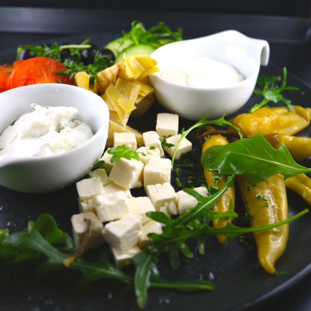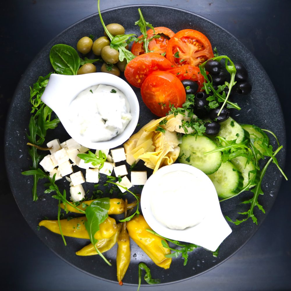 Mit eingelegtem Hirtenkäse, grünen Oliven, Peperoni, Gurken, Tomaten, dazu Tzatziki, Butter & Brot.