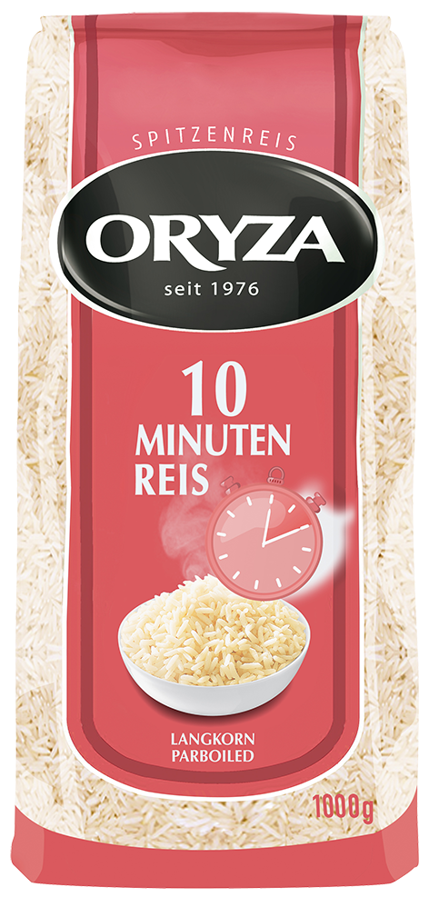 ORYZA 10-MINUTEN-REIS wenn es mal etwas schneller gehen soll! Dieser hochwertige Langkorn-Spitzenreis wurde besonders schonend durch ein spezielles Parboiling-Verfahren veredelt. So ist dieses Allround-Talent nicht nur in sehr kurzer Zeit fertig, sondern gelingt auch immer locker und körnig.
