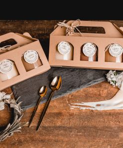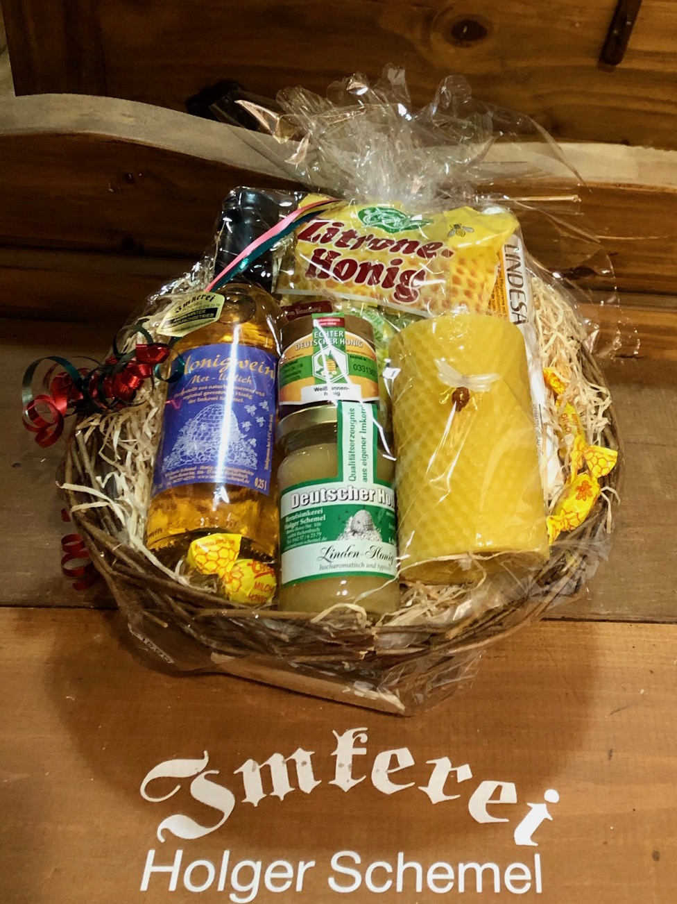 Weidenkorb, Durchmesser ca.24 cm, 1 Päckchen Honig-Bonbon, 1 x 125 g Honig aus eigener Imkerei, 1 x 30 g Honig aus eigener Imkerei, 1 x gerollte 100 % Bienenwachskerze + Biene, 1 x Handcreme mit Bienenwachs, 1 x 0,25 l Honigwein oder 1x Honigsecco 0,2l, 3 x Honig-Bonbon lose