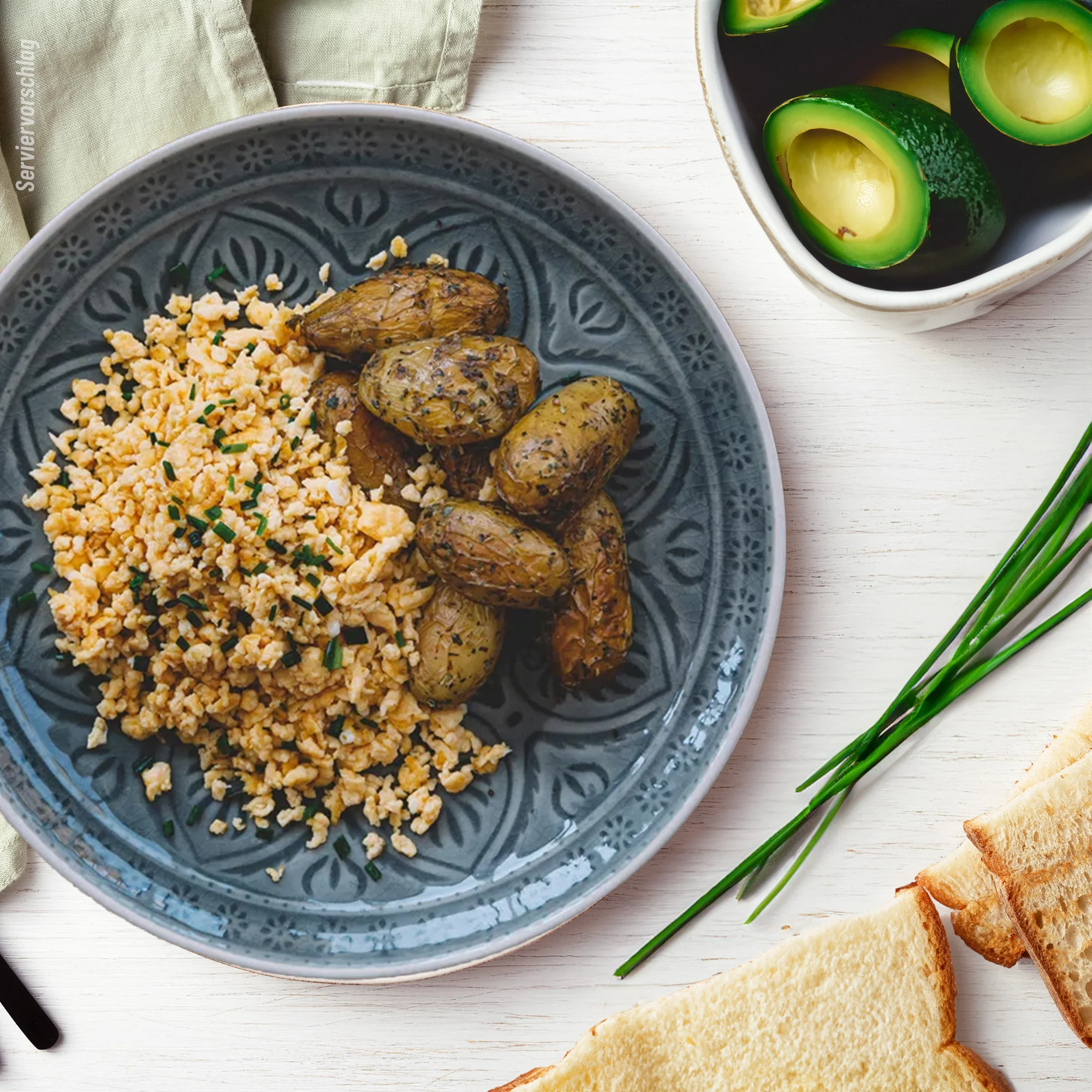 Rührei mit feinen Drillingskartoffeln. Perfekt gewürzt und abgestimmt.