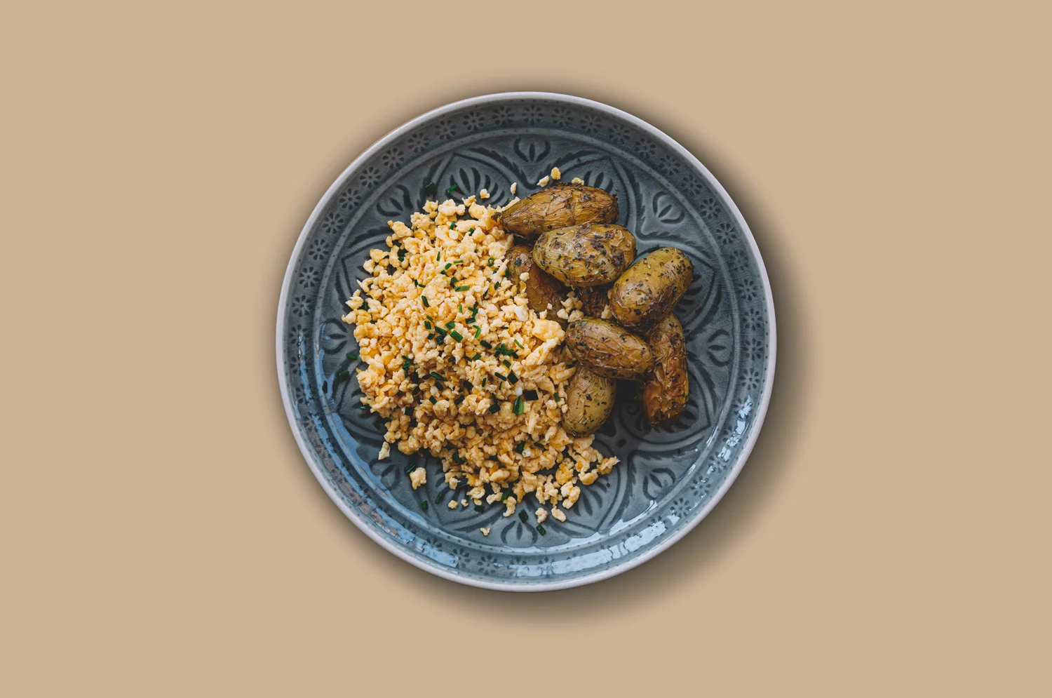 Rührei mit feinen Drillingskartoffeln. Perfekt gewürzt und abgestimmt. Optimal für morgens, mittags oder nach dem Workout. Bringen dir Energie, machen dich satt und füllen deine Speicher wieder auf.