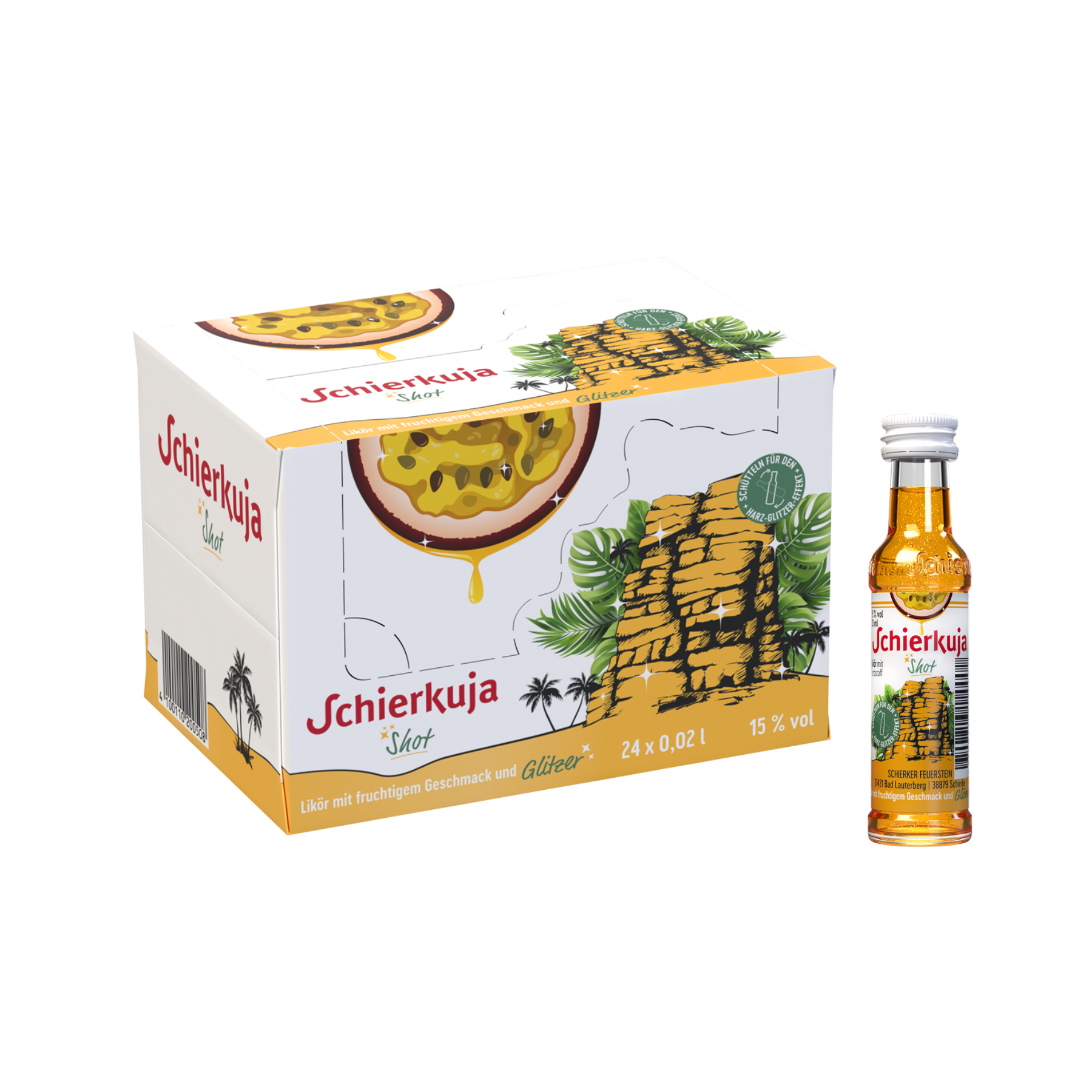 24 x 0,02 l Schierkuja Shot (15 % vol) mit Maracuja-Geschmack und Glitzer