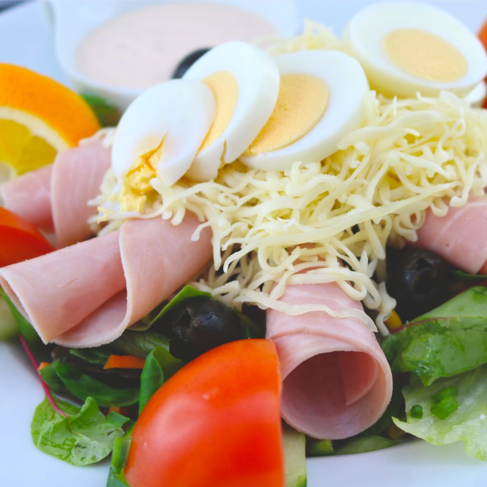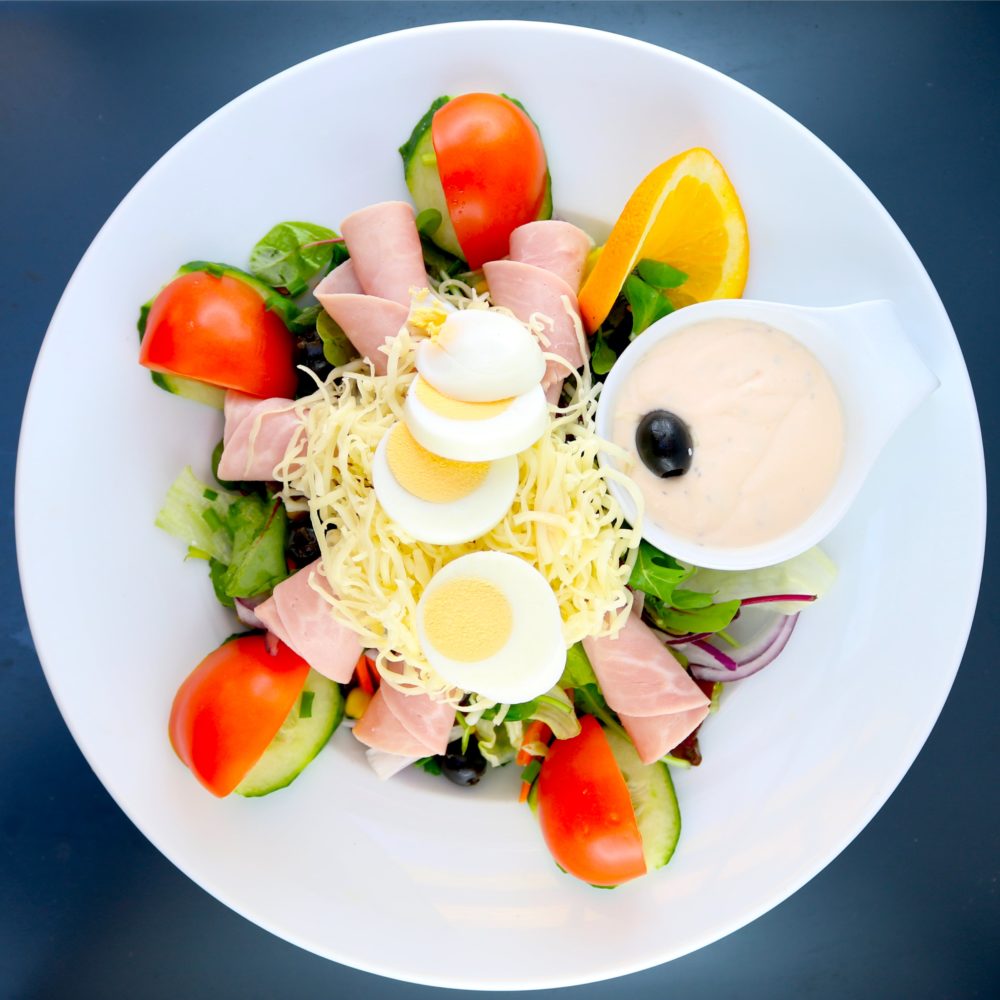 Mit Ei, gekochtem Hinterschinken, Käsestreifen, Oliven, Gurken & Tomaten, dazu Brot.