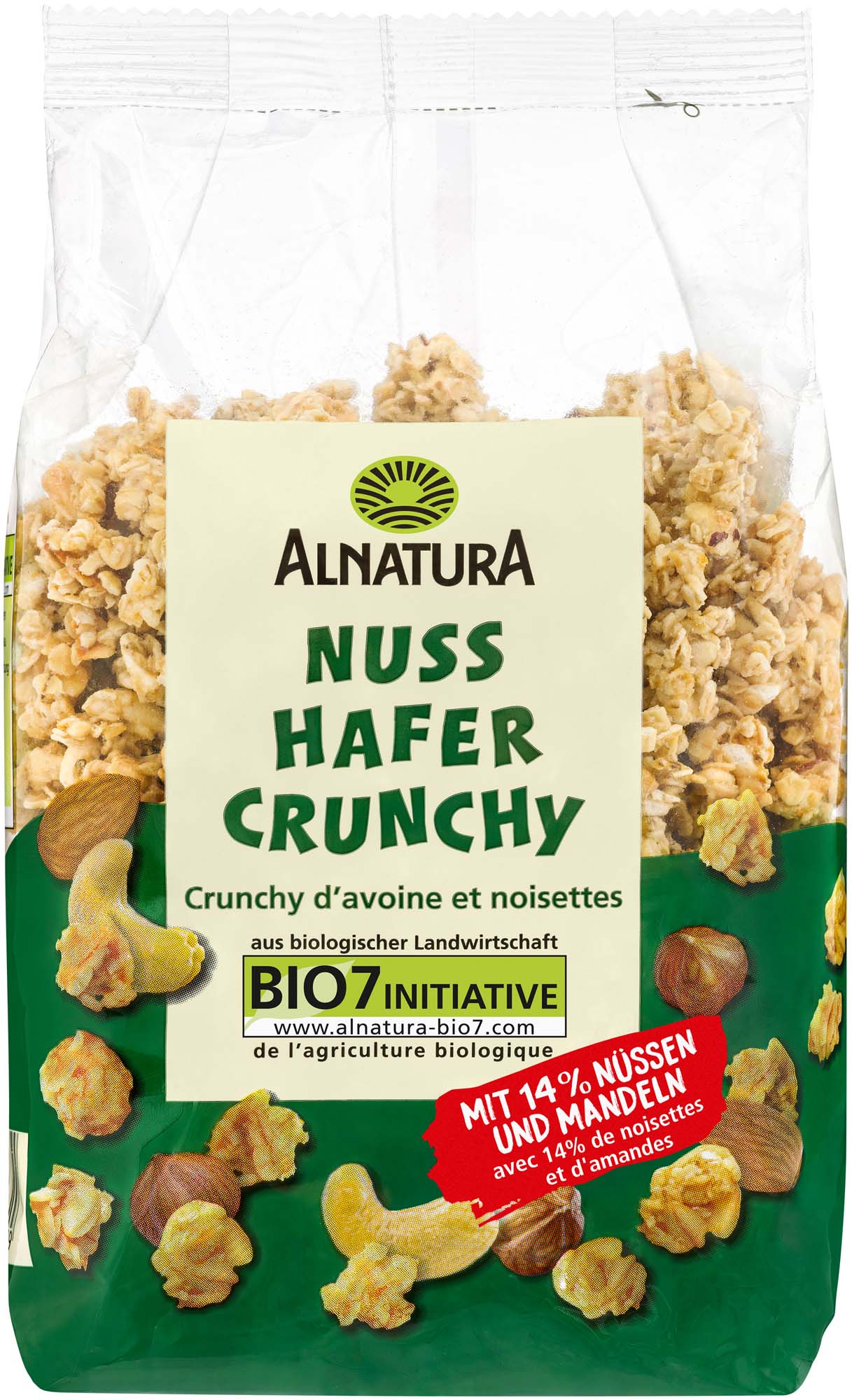 Ein nussiger Bio-Knuspergenuss für den Frühstückstisch oder zwischendurch: Das Alnatura Nuss-Hafer-Crunchy ist eine kross gebackene und mit Reissirup gesüßte Komposition aus Hafervollkornflocken und 14 Prozent Haselnüssen, Mandeln und Cashewnüssen. Das vegane Bio-Müsli schmeckt zum Beispiel mit Milch, Getreidedrink oder Joghurt.