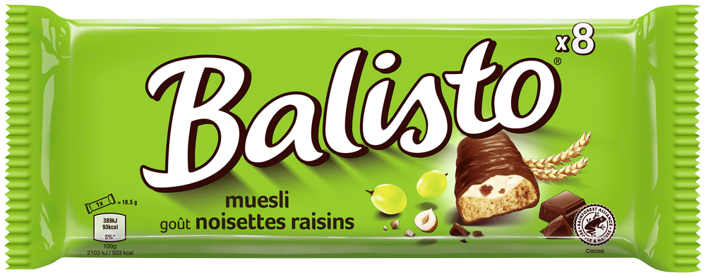 Im Balisto® Müsli-Mix wird der leckere Vollkornkeks mit saftigen Rosinen und einer köstlichen Crème mit Haselnuss-Geschmack vereint. Für das einzigartige Geschmackserlebnis wird der Riegel zusätzlich mit feinster Milchschokolade ummantelt.