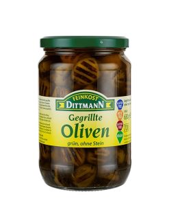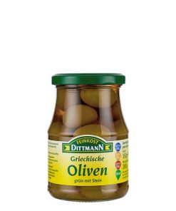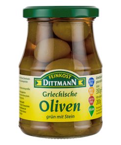 Grüne Oliven mit Stein** (64,3 %), Wasser, Meersalz, Zitronensaft**