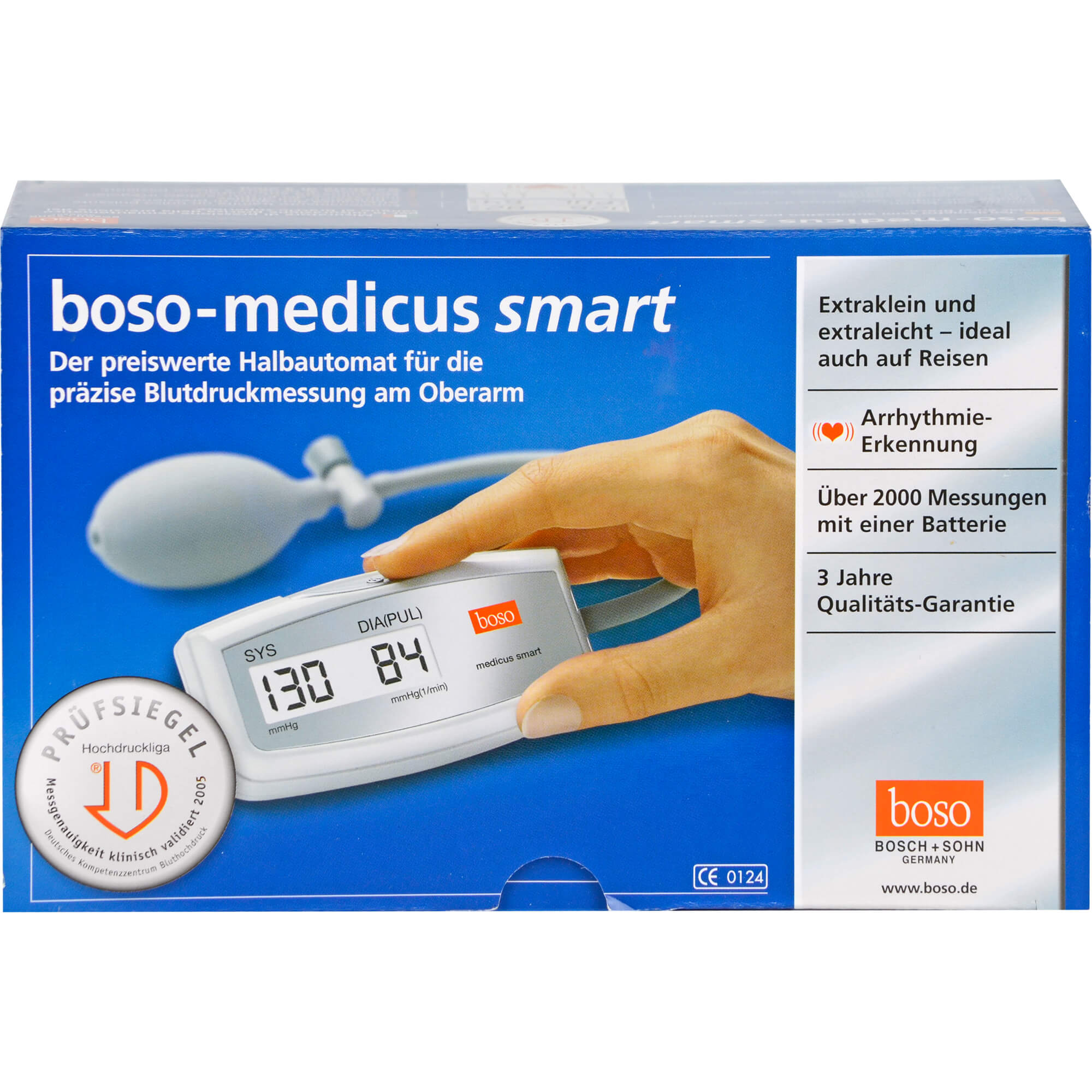 Halbautomatisches Blutdruckmessgerät für die Messung am Oberarm.Mit dem Prüfsiegel der Deutschen Hochdruckliga – Messgenauigkeit klinisch validiert in 2005.Arrhythmie-Erkennung – zeigt Herzrhythmusstörungen an.Memomatic für ein schonendes Aufpumpen.Mit Standard-Manschette für Armumfang 22 – 32 cm.Mit Etui, Batterien und Blutdruckpass.3 Jahre Garantie.Optional kann an das Gerät folgende Manschette angeschlossen werden: