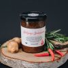 Zutaten: Bratwurst (60%) : (Schweinefleisch (83%), Trinkwasser, jodiertes Kochsalz, Gewürze (enthält Sellerie, Senf), Dextrose, Maltodextrin, Stabilisator (Natriumcitrat, Natriumphosphat), Antioxitionsmittel Ascorbinsäure, Geschmacksverstärker Mononatriumglutamat), Currysoße: (Tomatenmark (32%), Zucker, Branntweinessig, modifizierte Stärke, Speisesalz, Gewürze, Rote Beetepulver, Karamellzuckersirup, Maltodextrine, Verdickungsmittel (Johannisbrotkernmehl, Guarkernmehl).