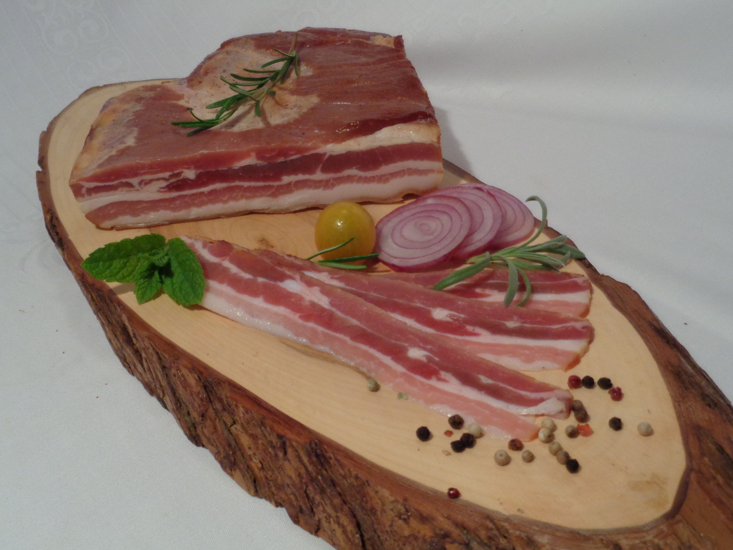 Magerer Schweinebauch mild gesalzen und geräuchert. Auch bekannt als Bacon.