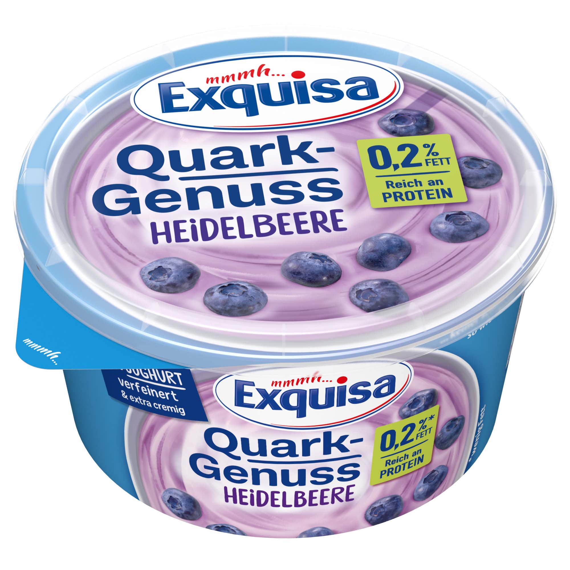 Genieße fruchtig-frische Heidelbeeren in Kombination mit feinem Exquisa Quark. Besonders cremig durch die Verfeinerung mit Joghurt und dabei herrlich leicht bei nur 0,2% Fett.