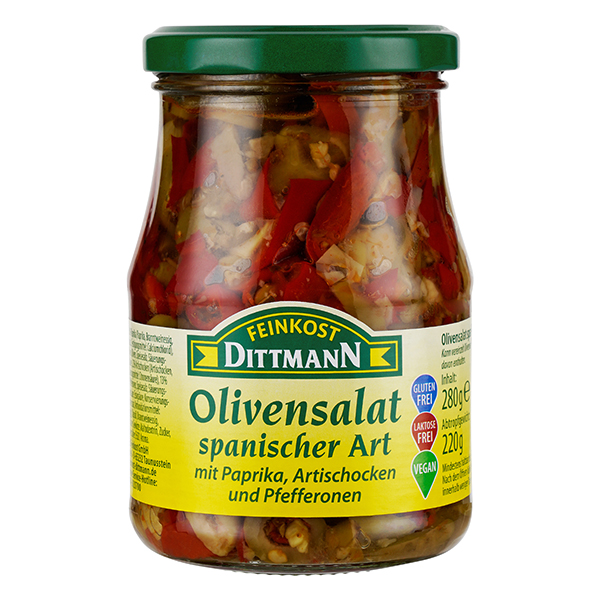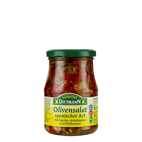Der Olivensalat nach spanischer Art ist ein herrlich mediterraner Genuss aus dem Hause Feinkost Dittmann. Die fein abgestimmte Komposition von grünen Oliven, Paprika, Artischocken und Pfefferonen, die mit ausgesuchten Gewürzen veredelt ist, wird Sie begeistern.