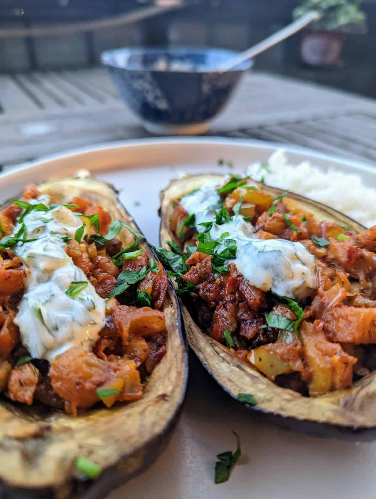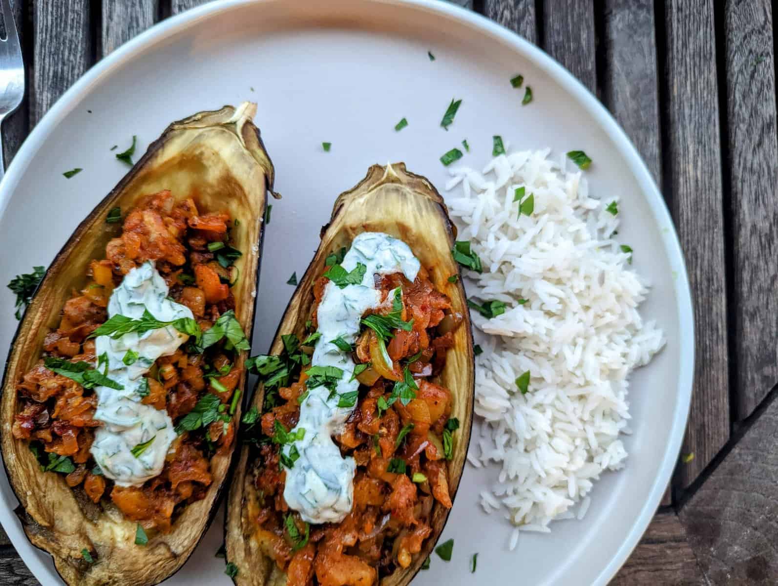 Butterweich geschmorte Aubergine, gefüllt mit Spitzpaprika und Tomaten, orientalisch gewürzt mit getrockneter Minze und Kreuzkümmel. Dazu einen Klecks Joghurt. Das Ganze mit Basmatireis serviert. Ein Veggie-Highlight.