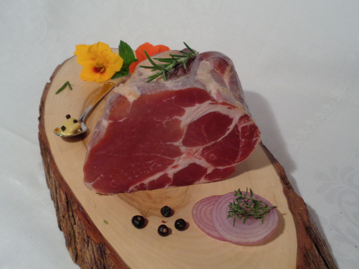 Mild gepökelt und in heißem Buchenrauch geräuchert. Aus dem leicht durchwachsenen Schweinekamm.