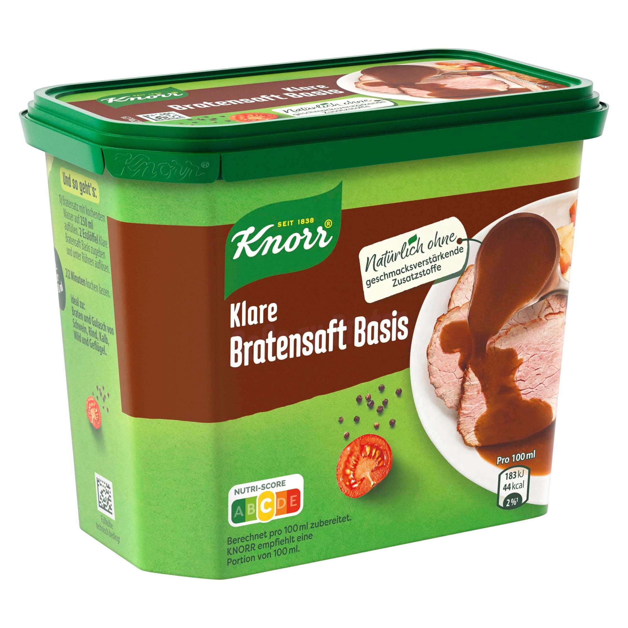 Knorr Klare Bratensaft Basis: Eine Kombination ausgesuchter Gewürze verleiht dieser Basis für Bratensaft einen herzhaft-würzigen Geschmack – perfekt als Basis für Bratensoßen, oder zum Würzen verschiedener Gerichte. Passt ideal zu Geflügel, Steak und Schnitzel. Knorr Bratensaft Basis verspricht schnelle und einfache Zubereitung. Zubereitung: Bratensatz mit kochendem Wasser auf 250 ml auffüllen. 2 Esslöffel Klare Bratensaft Basis zugeben und unter Rühren auflösen. 2 Minuten kochen lassen. Klassische Soßen mit vollem Geschmack einfach und schnell zubereitet. Die Knorr Soßen in der recyclebaren Dose bieten für jedes Gericht die passende Soße an. Helle Soße zu Gemüse- und Fischgerichten, kräftige Soße zu Braten extra oder cremige Rahmsoße für Kurzgebratenes – mit den Basissoßen von Knorr als Grundlage lassen sich zahlreiche eigene Kreationen bilden oder selbst gemachte Soßen ganz einfach binden, verfeinern und verlängern. Schmeckt immer, gelingt immer. Sind schon die vielen weiteren Produkte von Knorr bekannt? Dank den Fix-Produkten, Soßen, Fertiggerichten, Suppen, Salatdressings, Brühen und Bouillons gelingt jedes Gericht garantiert mit wenigen Handgriffen. Schnell und einfach erhalten so authentische Mahlzeiten ihren typischen Geschmack – egal, ob abwechslungsreiche vegetarische oder vegane Küche, herzhafte Fleischgerichte oder leckere Gemüsevariationen. Dabei ist es die Komposition ausgewählter hochwertiger Zutaten, die jedes Knorr Produkt besonders macht. Knorr verarbeitet nur sorgfältig schonend getrocknete Zutaten, denn das Trocknen ist eine der ältesten Methoden, um Lebensmittel natürlich haltbar zu machen. Da der Geschmack und die Hauptnährstoffe der frischen Zutaten weitgehend erhalten bleiben, passen Lebensmittel aus getrockneten Zutaten perfekt in unseren stressigen Alltag. Essen mit Knorr ist unkompliziert und sorgt darüber hinaus für ein gutes Gefühl: 95 Prozent unserer Gemüse und Kräuter stammen heute schon aus nachhaltigem Anbau. Denn wir bei Knorr glauben, dass die Verwendung nachhaltig angebauter und beschaffter Zutaten einen großen Unterschied für den Geschmack unserer Produkte, das Wohlbefinden der Landwirte und die Zukunft des Planeten macht. Knorr. Iss, was gut ist.
