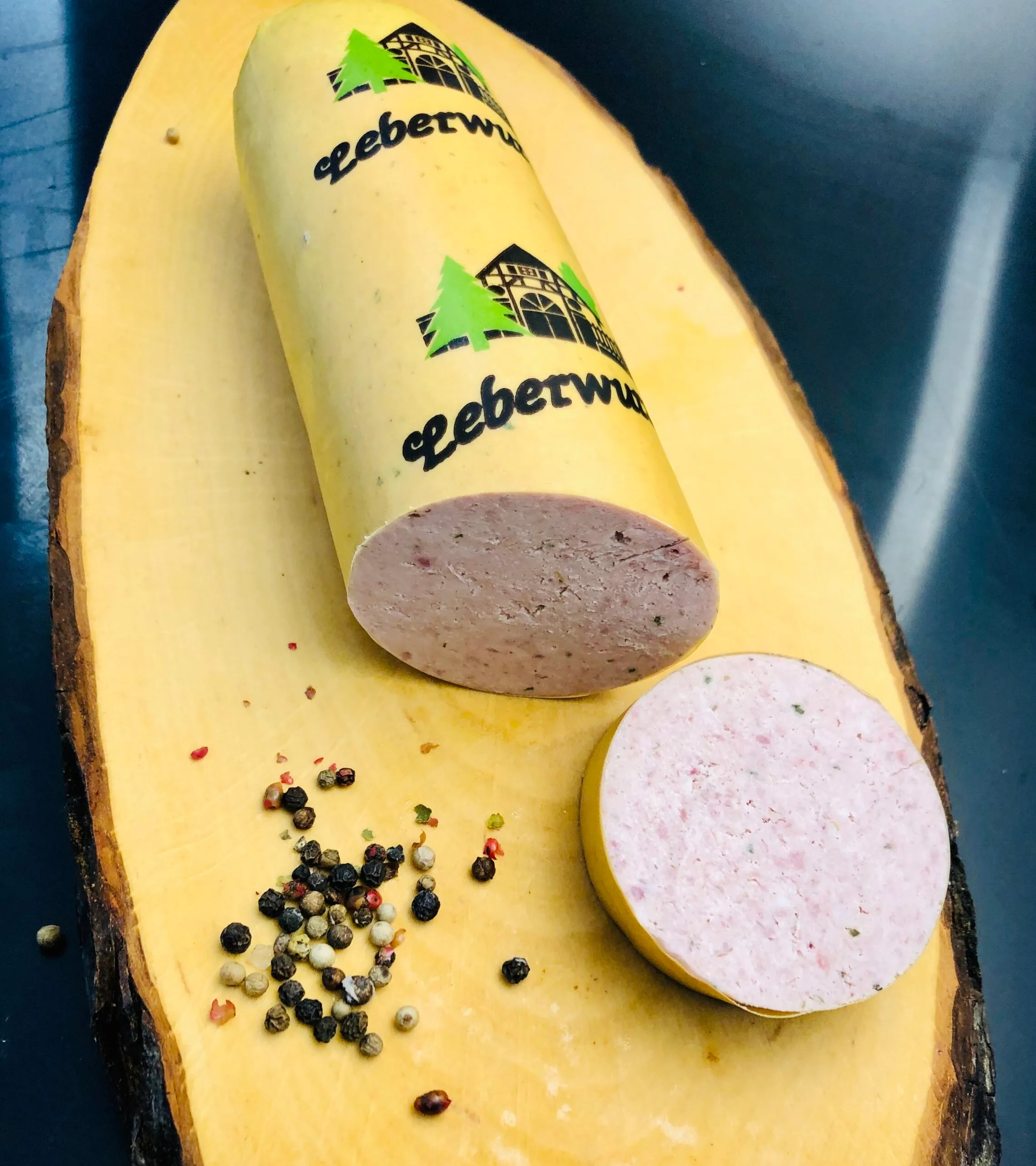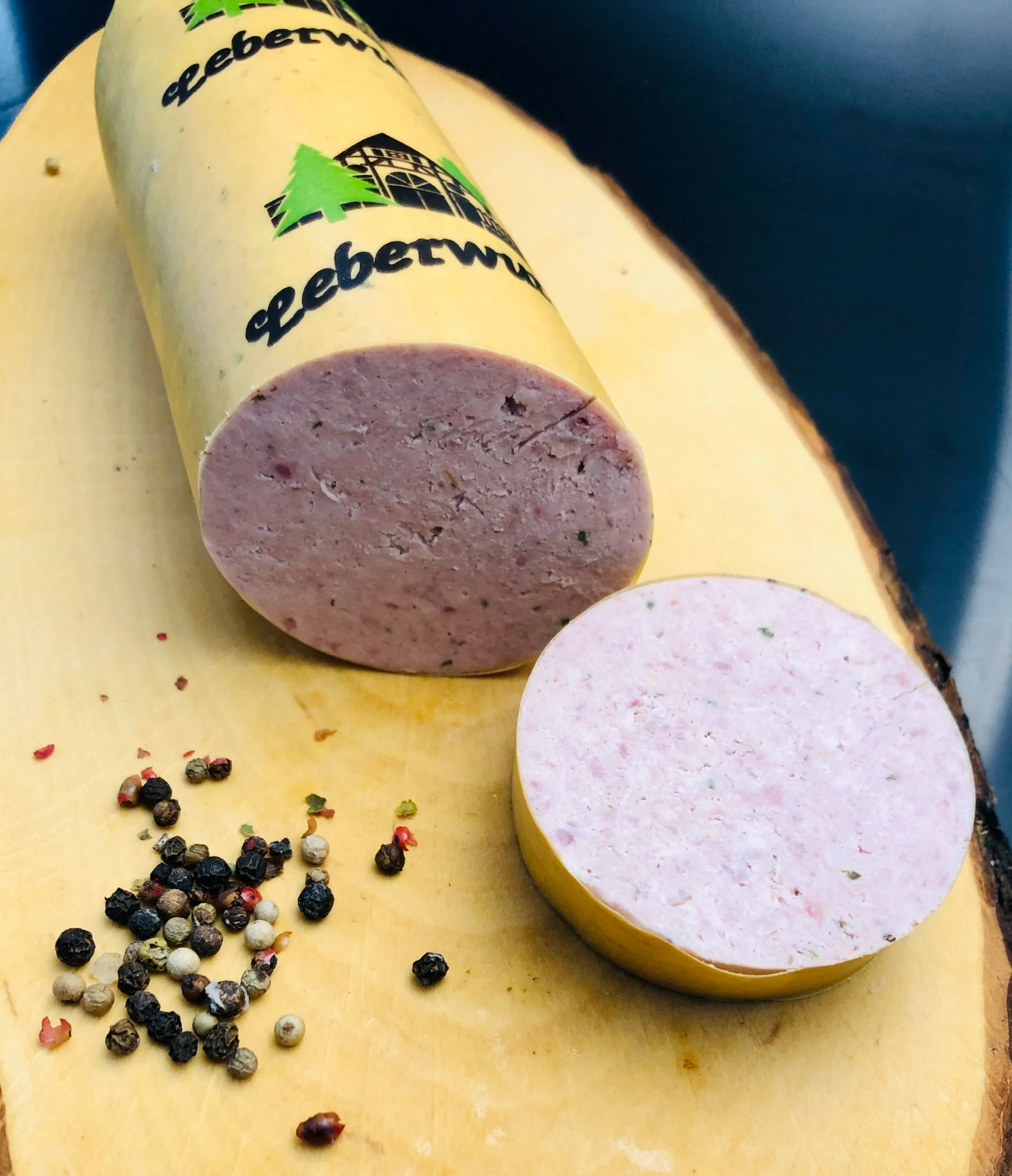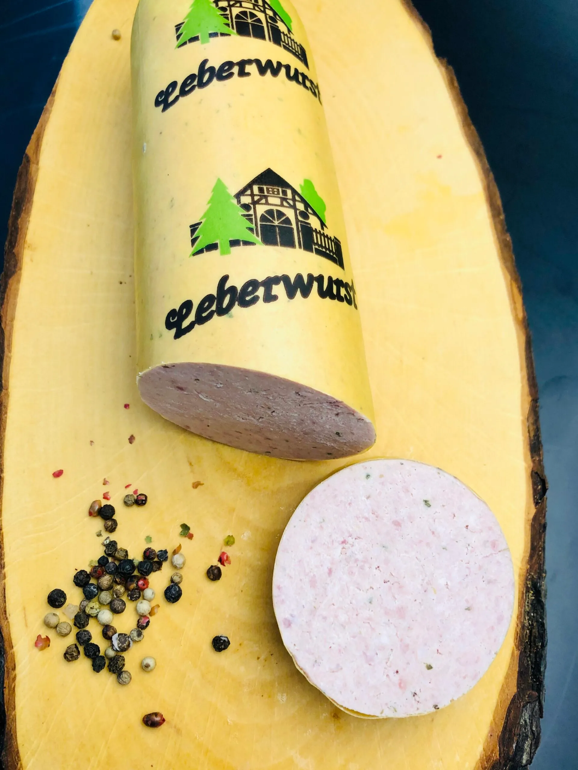 Für die deftige Landleberwurst verwenden wir mageren Schweinebauch, fette Schweinebacke und Schweineleber. Diese werden über Nacht mit Nitritpökelsalz umgerötet, dann bei niedriger Hitze über 45 Minuten angebrüht. Nach dem Kuttern wird diese Einlage zusammen mit klassischer Delikateßleberwurstmasse in Därme gefüllt, gebrüht und geräuchert.