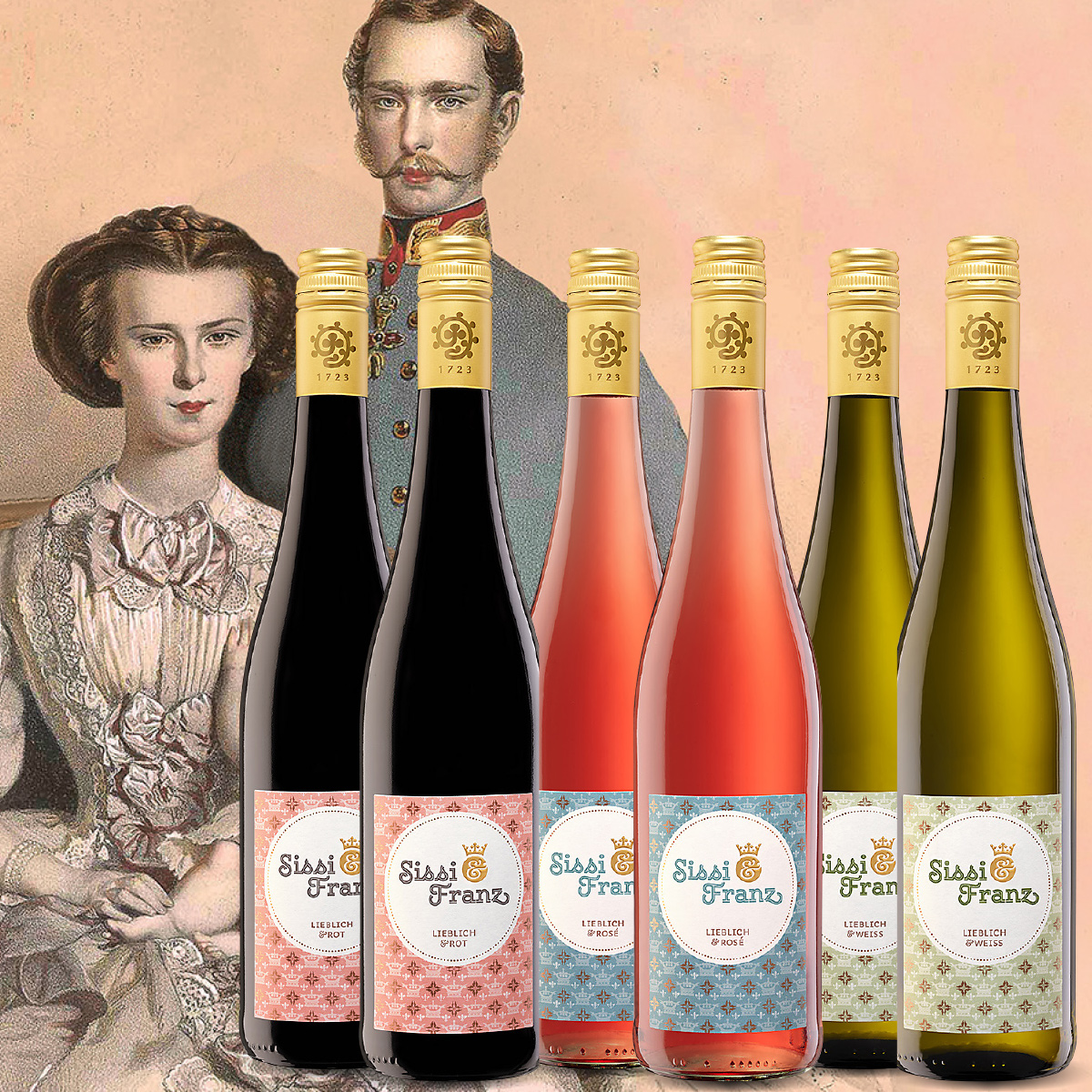 je 2 Flaschen: 2024 Sissi & Franz Rosé lieblich, 10,5 % vol. 2023 Sissi & Franz Rotwein lieblich, 11,5 % vol. 2024 Sissi & Franz Weißwein lieblich, 10,5 % vol.