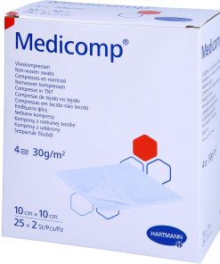 Die saugfähige VlieskompresseDie Vlieskompressen bestehen aus einer Mischung von Viskose- und Polyesterfasern. Der Viskoseanteil beträgt zwischen 67% und 70%, der verbleibende Anteil besteht aus Polyesterfasern. Die Kompressen sind frei von Bindemitteln und optischen Aufhellern, luftdurchlässig und vierfach gelegt sowie in verschiedenen Größen erhältlich. Die Kompressen können auseinandergefaltet werden, wenn ein größeres Format benötigt wird. Die sterilen Kompressen sind in Papierfolienbeutel verpackt. Die unsterilen Kompressen werden in Papierbeuteln geliefert.