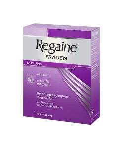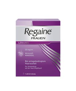 Regaine Frauen 20 mg/ml Lösung. Wirkstoff: Minoxidil. Anwendungsgebiete: Stabilisiert bei Frauen den Verlauf der androgenetischen Alopezie vom weiblichen Typ (charakteristische anlagebedingte diffuse Kopfhaarverdünnung im Scheitelbereich). Die Behandlung fördert das Haarwachstum und kann so dem Fortschreiten dieses Haarverlustes entgegenwirken. Warnhinweise: Enthält Propylenglycol.