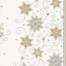 Die eleganten SV Stars & Swirls silver Servietten bieten mit ihrem goldenen und silbernen Stern-Design und der weichen Airlaid-Qualität eine luxuriöse Tischdekoration für festliche Anlässe.