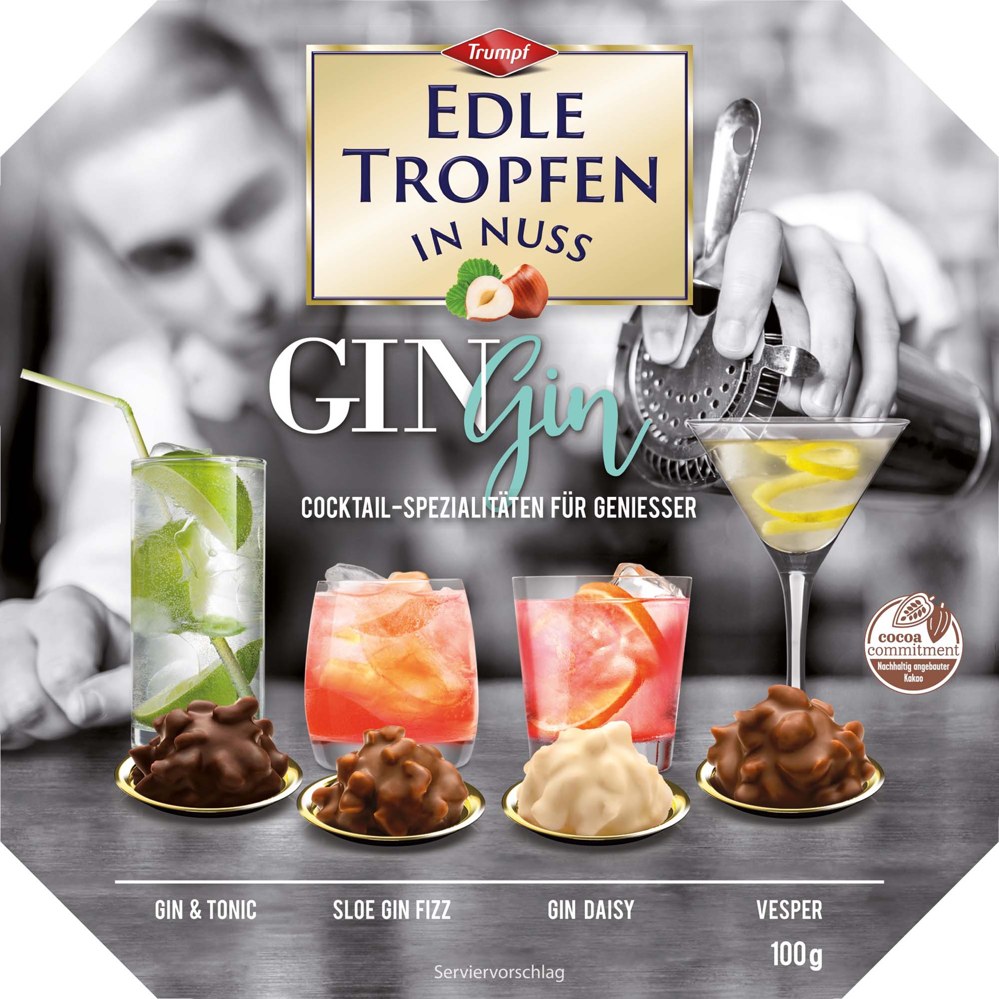 Die perfekte gemixten Gin-Spezialitäten für Genießer: Die vier Geschmacksrichtungen Gin & Tonic, Sloe Gin Fizz, Gin Daisy und Vespert umhüllt von leckerer dunkler, heller und weißer Vollmilchschokolade. Für den besonderen Knack-Moment sorgt eine Zuckerkruste, welche den flüssigen Kern umschließt. Abgerundet werden die Pralinen nur noch durch die feinen Haselnuss-Splitter im Schokoladen-Mantel. Und genau das macht unsere Edlen Tropfen in Nuss zu einer ganz besonderen Alkoholspezialität. Ob bei einem entspannten Nachmittag zum Kaffee, ob mit Freunden zu teilen oder einfach mal so – Seit über 55 Jahren begeistern die edlen Tropfen mit ihrem unvergleichbaren Geschmack – einfach unwiderstehlich!