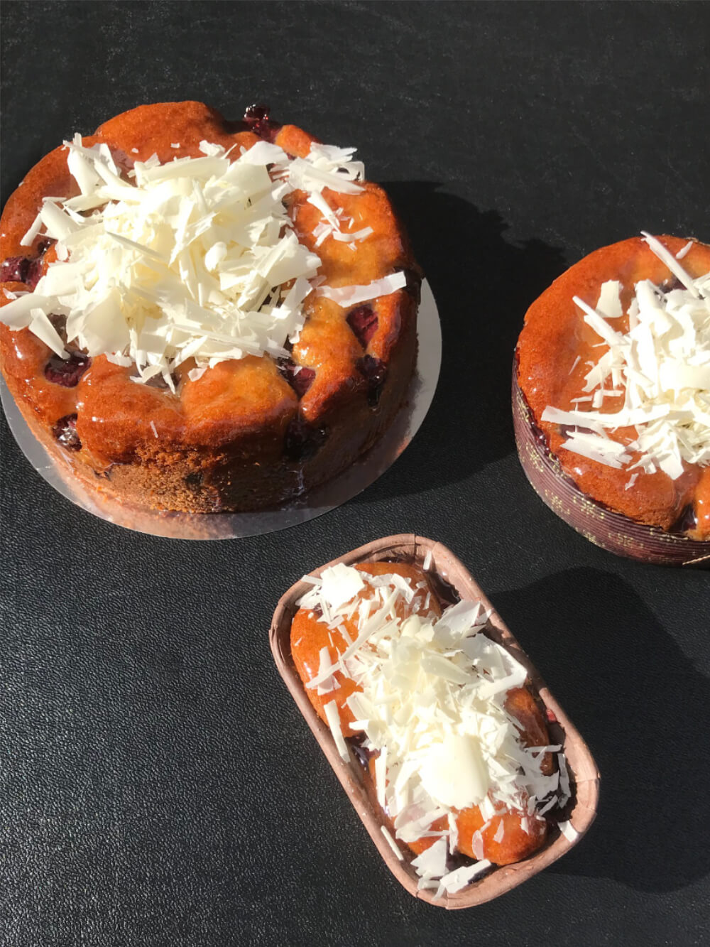 Kirschkuchen nach Großmutters Art, saftige Rührkuchen-Rezeptur ohne Mehl, mit Mandelgrieß, Schokostückchen und Kirschen – verziert mit weißen Schokospänen