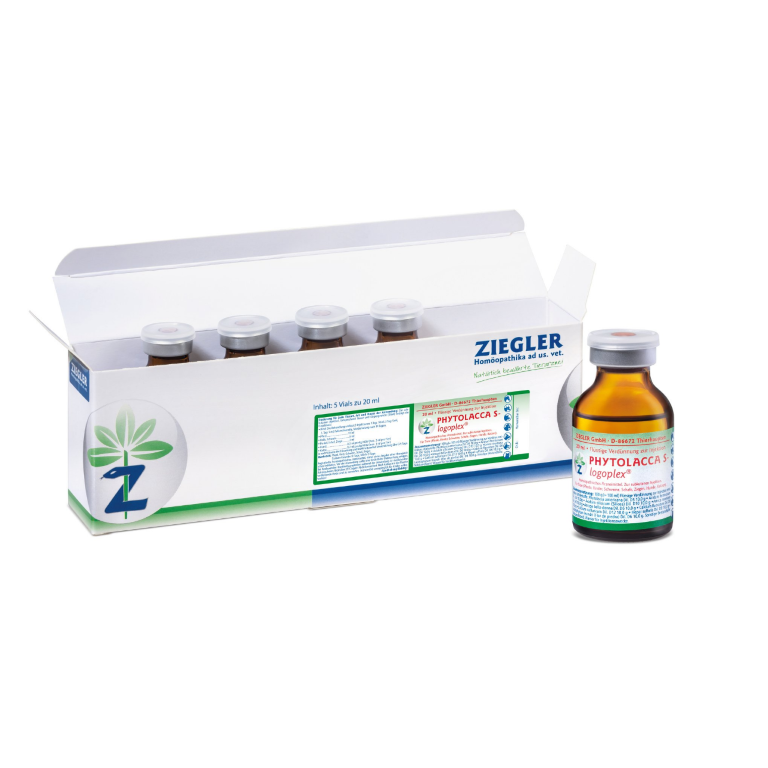 Phytolacca S-logoplex ermöglicht durch seine einzigartige Zusammensetzung aus mehreren pflanzlichen, mineralischen und tierischen Bestandteilen ein leichtes und unkompliziertes Anwenden bei verschiedensten Tierarten. Diese umfassen Pferde, Rinder, Kälber, Schweine, Ferkel, Schafe, Ziegen, Hunde sowie Katzen. Es handelt sich um ein registriertes homöopathisches Arzneimittel und daher ohne Angabe einer therapeutischen Indikation. Vor Entnahme Arzneimittel gut durchschütteln. Je nach Schwere der Erkrankung und Krankheitsverlauf Verabreichung über 3-5 Tage. Nicht länger als bis zur vollständigen Heilung des Tieres. Ziegler-Produkte sind dermatologisch geprüft und entsprechen höchster Qualität. Inhaltsstoffe: Phytolacca americana Dil. D5. Acidum formicicum Dil. D4, Acidum silicicum (Silicea) Dil. D10, Arnica montana Dil. D6, Atropa bella-donna Dil. D6, Calcium fluoratum Dil. D8, Calcium sulfuricum Dil. D12, Hepar sulfuris Dil. D8, Lophophytum leandri (Flor de piedra) Dil. D6, Natriumchlorid, Wasser für Injektionszwecke.