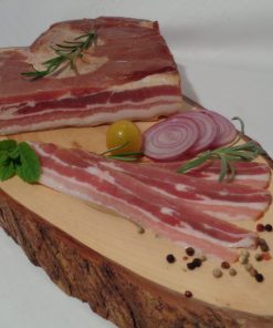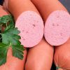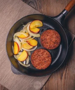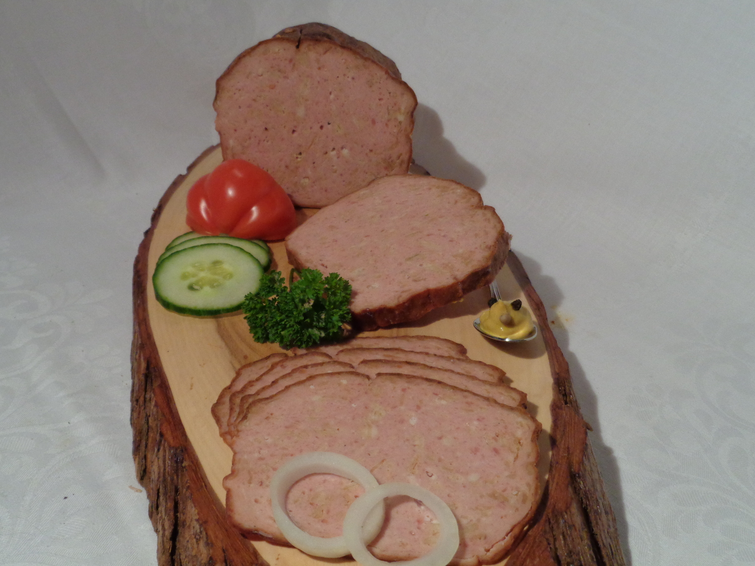 Fleischkäse mit Röstzwiebeln, fertig ausgebacken mit schöner Kruste.